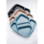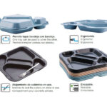 Están dotadas de 5 compartimentos: dos grandes para platos principales, dos pequeños para postres, fruta, pan, vaso y un hueco central rectangular para posicionar los cubiertos.