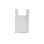Paquete de bolsa de camiseta color blanco maxi 70 % reciclada, utilizada generalmente por hipermercados, supermercados y todo tipo de establecimientos comerciales.