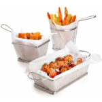 Fabricadas en acero inoxidable de gran resistencia y calidad. Una forma elegante y original de servir toda clase de aperitivos y tapas. La presentación puede ser sobre papel absorbente o bien directamente sobre el cestillo.