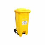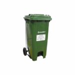 Contenedor basura de 120 litros de capacidad, modelo YY-120C. Incorpora un pedal y también ruedas de goma dura con un diámetro de 19 centímetros. Material: polietileno de alta densidad.