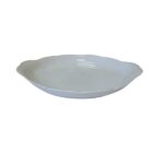 Fuente redonda honda con asas laterales grabadas con motivos de hojas, un diseño elegante y funcional que realza cualquier mesa.