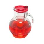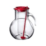 Jarrra sangria de cristal transparente con forma redonda con deposito para introducir hielo y mantener la jarra muy fria, tapa color roja con agujero con pala mezcladora.