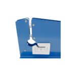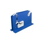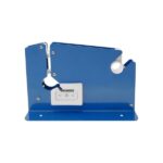 Maquina metalica robusta lacada en azul para precintar bolsas de plastico mediante cinta adhesiva.