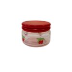 Tarro en vidrio transparente con tapa de plástico con decoración cerezas.