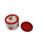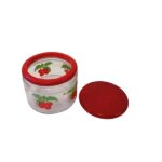 Tarro en vidrio transparente con tapa de plástico con decoración cerezas.