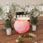 Vela millennium bola hueca con tallado de rosas de color rosa.