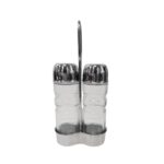 kit vinagrera aceitera de vidrio transparente con tapón y soporte inox. extra de 2 senos, con tapón antigoteo.