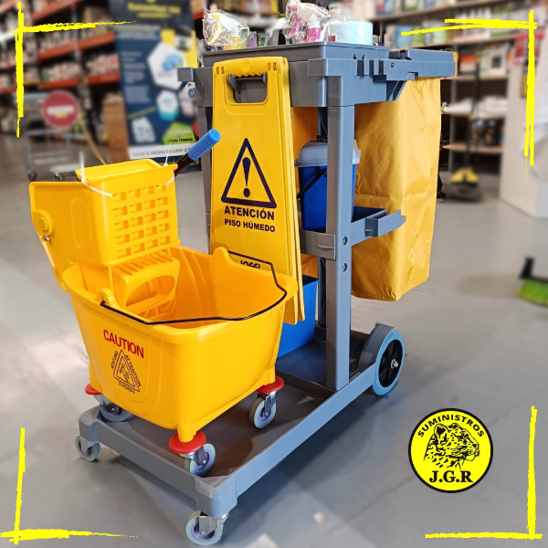 En Suministros JGR, sabemos lo importante que es la limpieza para tu negocio. Por eso, tenemos disponible un carro de limpieza diseñado especialmente para empresas que buscan eficiencia y profesionalismo en el mantenimiento de sus instalaciones.